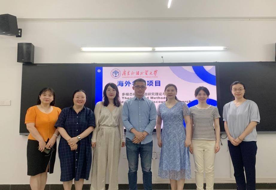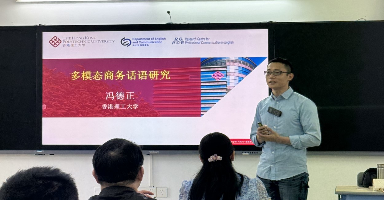 2024年5月17日下午,广东外语外贸大学国际商务英语学院主办的海外名师项目《多模态语篇分析与翻译研究》第一讲“多模态商务话语研究理论与方法”在第一教学楼南楼324室举行。项目主讲人为香港理工大学英文与传意学系副教授、博士生导师冯德正老师,副院长陈潇潇教授受邀对主讲人进行引介。该讲座由本项目负责人吕洁副教授主持,商英、高翻和英文学院多名教师和众多研究生聆听了本次讲座。