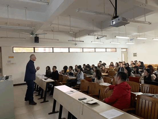 12月5日14:30-16:30,我校云山讲座教授、澳大利亚悉尼大学Terry Royce博士在北校区第六教学楼B-314教室为国际商务英语学院的师生做了题Business and economics English: a FUNCTIONAL, MULTIMODAL, PEDAGOGICAL view(从功能、多模态和教学视角看商务英语和经济学英语)。本次讲座是Royce教授关于商务英语专题系列讲座的第一讲。讲座由商英学院副教授、英语教学部系主任汪谓超博士主持,商英学院彭玲玲副院长、法律英语系主任张新红副教授、陆璐副教授、严小庆博士、张少敏博士和陈光亚老师、外籍教师Elaine,以及商英学院的部分本科生、硕士生和博士生参加了本次讲座。