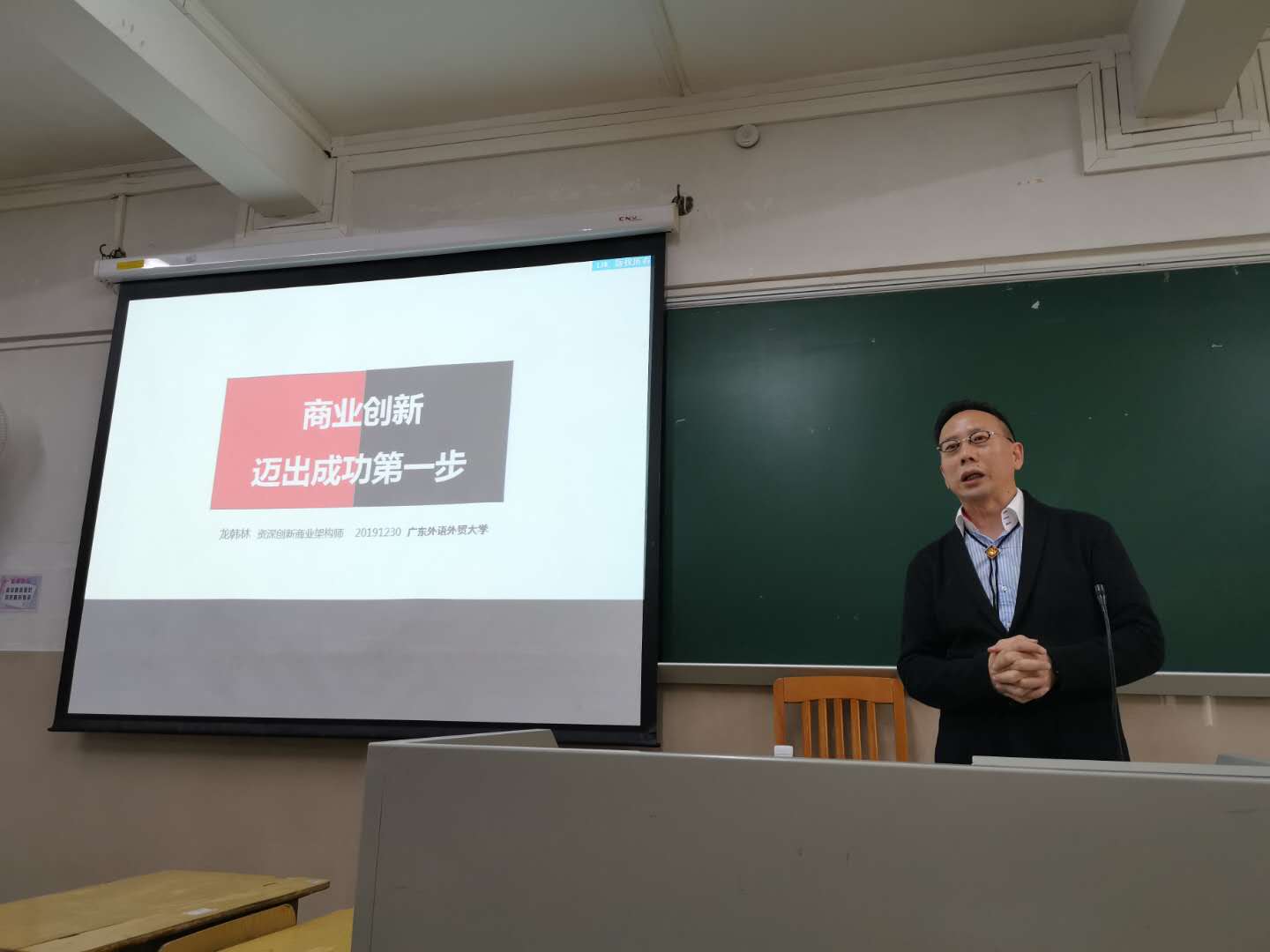 2019年12月30日下午两点,广州赛伦盖蒂企业管理咨询公司总裁/首席咨询师、香港森城控股集团副总裁龙韩林先生来到广外与商英学院商务英语专业金融英语方向2017、2018级同学做题为“商业创新——迈向成功的第一步”的分享会。分享会由英语教学部主任汪谓超主持,肖武东老师参加了本次分享会。