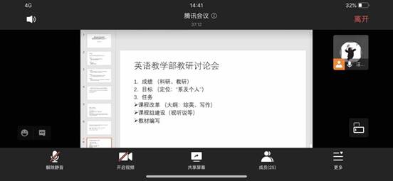 10月22日下午2:00国际商务英语学院英语教学部在腾讯会议平台进行了本年度第八次教研活动。学院胡春雨副院长、彭玲玲副院长、系部主任汪谓超副教授和英语教学部教师共三十余人参加了此次教研活动。本次教研活动由汪渭超副教授主持,内容包括:1、邀请我校云山青年学者、我院经贸系何宇菲博士作科研经验分享,2、组织我部教师按照《普通高学校本科外国语言文学类专业教学指南》,讨论教案修订、部分专业方向课程和学分调整等事项。