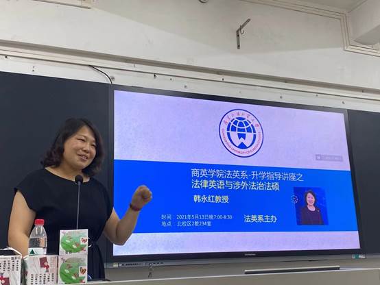 2021年5月13日晚,广外法学院副院长韩永红教授、商英学院法律英语系前系主任为我院学生做了有关法律英语、涉外法治法硕项目与升学就业指导的讲座。本次讲座由商英学院法英系组织,旨在向同学们介绍我校的法学硕士项目和法英学生未来的发展方向,解答同学们对考研和就业方面的困惑。法英系张新红主任、张少敏老师和谢静老师,以及法英系2018级、2019级和部分其他系的本科同学参会。