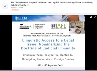 2021年9月13日至15日,为期三天的“第十五届国际法律语言学家协会双年会(IAFL15)”线上会议顺利召开。本次会议由国际法律语言学家协会(International Association of Forensic Linguists,简称“IAFL”)主办,由英国伯明翰阿斯顿大学的阿斯顿法律语言学研究院(AIFL)承办,是法律语言学领域两年一度的国际顶级学术会议。大会通过提前上传视频、会上实时问答、会后观看录像等方式在线上举办,来自全球多个国家的110余位法律语言学学者相聚云上,共享这场学术交流盛会。我校袁传有老师、徐优平老师、张少敏老师,法律语言学方向的博士研究生罗兴、付悠悠和许文涛,研二及研三多位硕士研究生参加了此次学术盛会。20名广外师生组成了庞大的广外代表团,在本次会议上分享了中国的法律语言学研究成果,彰显了广外的研究力量。