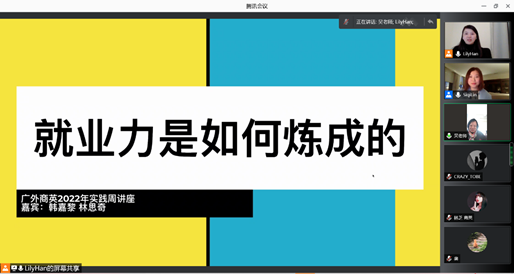 2022年1月11日上午,现世界五百强企业谷歌资深战略采购经理、2008级商英学院国际商务管理专业校友韩嘉黎女士,硅谷独角兽公司Automation Anywhere增长营销高级经理、2011级国际新闻专业校友林思奇女士受邀作题为“就业力”的线上讲座,吸引了众多同学的在线参与和学习。