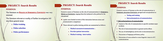 之后,Royce教授详述了他是如何通过系统性综述展开此次研究的。他的系统综述主要是从“理论层面的交际能力”和“压力之下的工作场合的交际能力”这两个维度展开的,其中理论层面包含应用语言学和语言教学,工作场合涉及警察、医疗、航空行业和评估情境下产生的问题。研究发现:极少有文献关注到压力情境下的警察工作,大量文献的关注点主要集中于沟通在压力情境下的医疗、航空、教育等工作中所发挥的作用。
