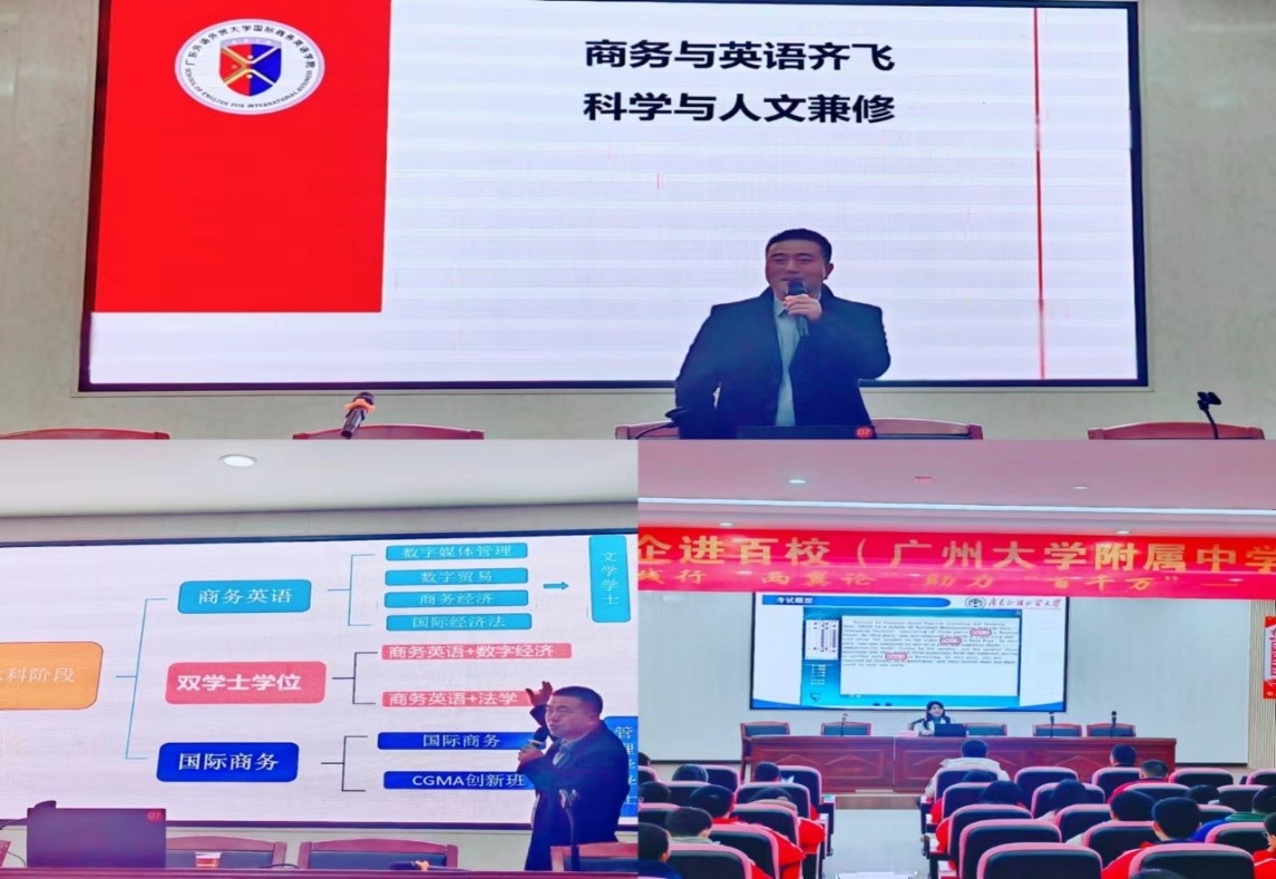 上午,宣讲队伍抵达首站英德广大附中,该校副校长胡玉新热情接待。双方首先围绕提升学生数智素养、巩固优质生源基地建设、继续深化双方交流合作等事宜进行了探讨。随后,严小庆主任对300多名高三毕业生进行英语备考指导,并对该校参会的英语教师进行教学提升指导。商英学院副院长汪谓超从师资力量、学科发展、人才培养创新等方面介绍了我校情况,重点介绍了2024年我院新开办的双学士学位项目(商务英语+数字经济、商务英语+法学)及升级后的商务英语专业方向(数字媒体管理、数字贸易、商务经济、国际经济法)。