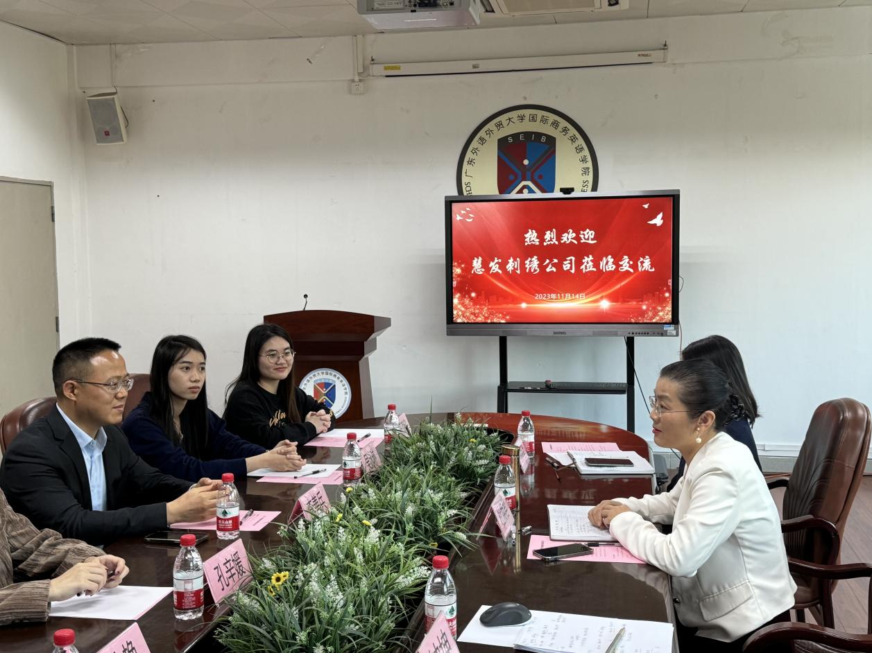 李善兵详细介绍了公司的发展历程及主营业务。公司发展迅猛主要得益于三大资源。一是人才资源。公司与广外等外语类院校有着密切的联系与合作,能够为公司提供大量精通外语,熟悉商务的复合型人才;二是客户资源。公司客户大多为欧美发达国家地区的优质客户,如环球、华纳、索尼等,自带IP流量,有大量粉丝群体;三是供应商资源。公司依靠500多家供应商,真正实现前有客户,内有培训,后有工厂的良性闭环。他表示,希望通过本次座谈会,加强与广外和学院的联系,实现双方的互利共赢。