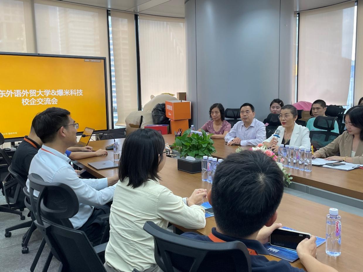 参观结束后,双方围绕校企合作、人才培养、公司招聘等方面进行了深入交流。杜焕君副书记对爆米科技公司的用心接待表示感谢并介绍了我校历史沿革、学科发展、语种数量、专业实力和学院人才培养特色,并提出可以深化校企合作模式,不仅要把送学生“送出去”校园,还要邀请企业“走进来”开展岗位职务介绍、就业创业经历分享等系列讲座,并让优秀员工代表为在校学生开展职场技能培训指导,利用社会资源,共育人才,实现校企互惠共赢、共同发展。