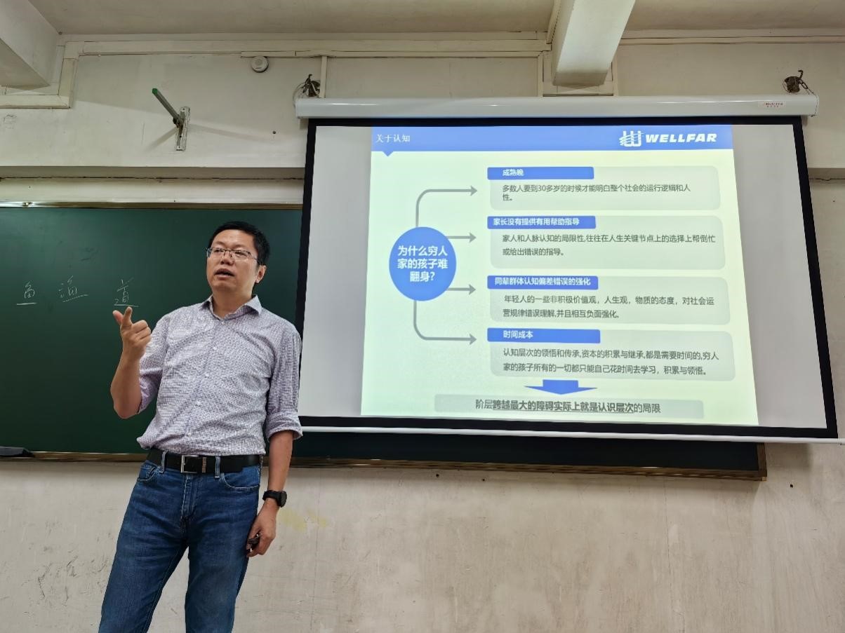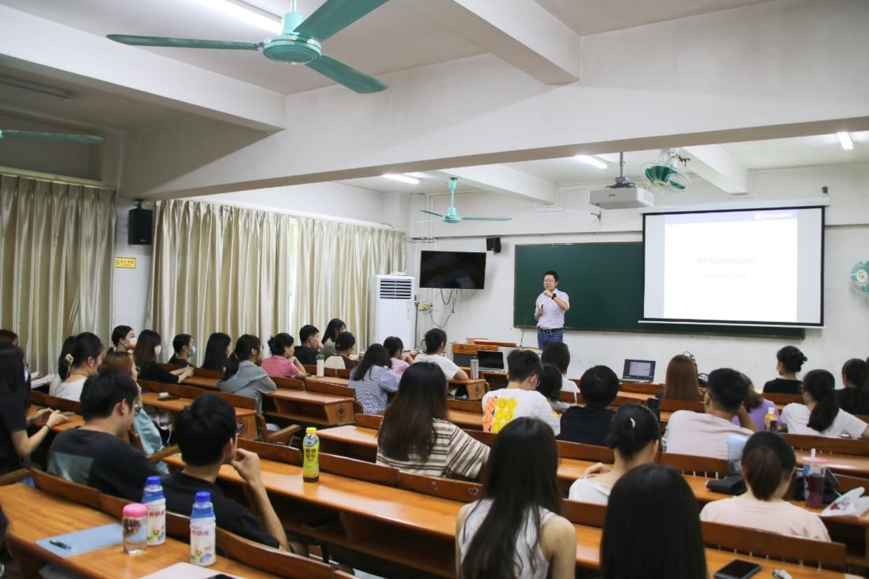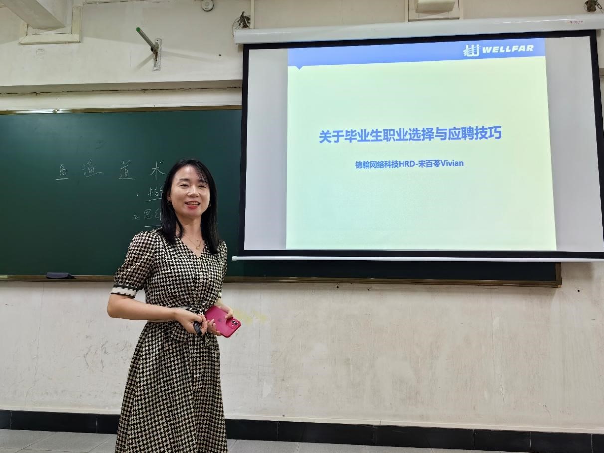 首先,锦翰CEO王征豫向同学们分享关于毕业生的职业规划。王征豫从自我认知和社会环境两方面出发,深入剖析了当代青年的认知局限,提出了“认知就是核心竞争力”,建议同学们打开眼界、强化理论学习和自我反思。接着他通过图表数据等分析了现在的就业外部环境,提到了不管在何种类型的企业——“能力都是最重要的”,引导同学们要积极改变认知、独立思考,在自己的能力范围内做最优选。