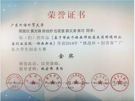 以商英学院2019届周慧欣为负责人的项目获2018年“挑战杯·创青春”广东大学生创业大赛金奖