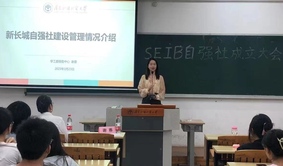 随后,学生工作部、校自强社指导老师谢蓉细致的介绍了校自强社的运营模式以及学校的资助政策与育人活动。并表示SEIB自强社作为北校区第一个学院分社,希望以此次自强社分社成立为契机,精心策划、认真组织,将自强社这个平台建设好、运用好。日后能与校自强社增进合作,共同进步。