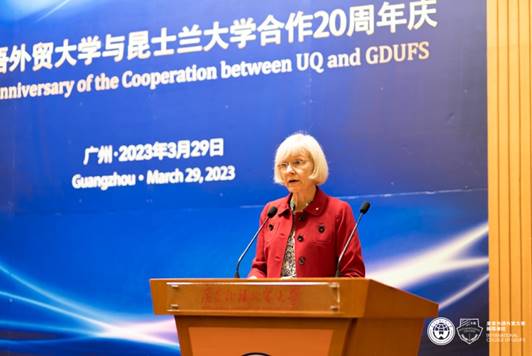 3月29日,广东外语外贸大学(以下简称“广外”)与昆士兰大学合作二十周年庆典活动在广外白云山校区举行。广外党委书记、校长石佑启,昆士兰大学校长黛博拉·特里(Deborah Terry AO),澳大利亚驻广州领事馆总领事邓安义,广东省教育厅交流合作处四级调研员周柳余,国际学院办学督导陈林汉和副院长(主持工作)刘田苗等代表出席庆典庆祝两校合作20周年,共同回顾过往交流成果,展望未来合作方向。庆典活动由广外副校长焦方太主持。