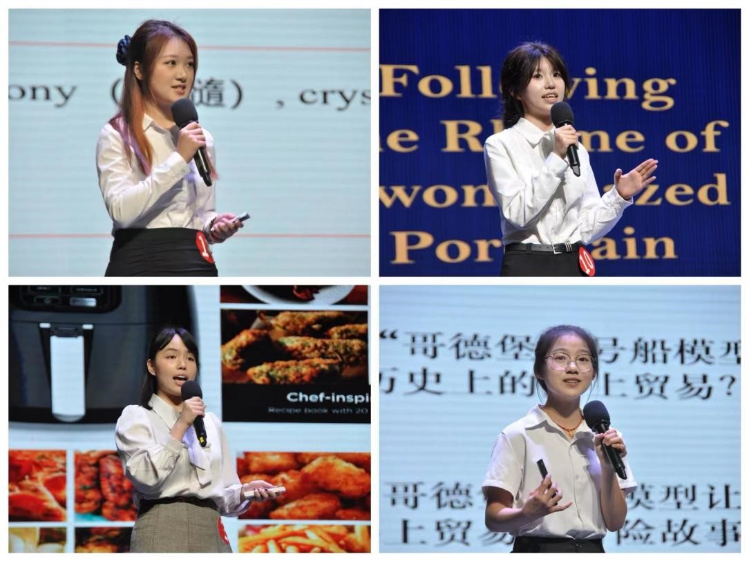 观古今于须臾,抚四海于一瞬。比赛内容围绕“海上丝绸之路”,立足于广州博物馆馆藏文物和陈列展览。选手们先进行三分钟的英语讲解,随后AI将围绕选手所讲解的展品进行现场提问,选手在三分钟内用中文进行作答。18位商英学子为我们介绍了东汉陶船,广州三塔,广彩人物纹大碗,承盘活链铜博山炉,水晶玛瑙玉髓玻璃珠等精美的文物,以出类拔萃的双语水平和卓越专业的讲解能力向观众展现了古代广州作为中国重要的商都,“海上丝绸之路”的重要枢纽其源远流长的历史。中场休息由广州博物馆讲解员郝春明进行现场专业讲解展示,以声音诠释文化遗产的魅力令观众身临其境。
