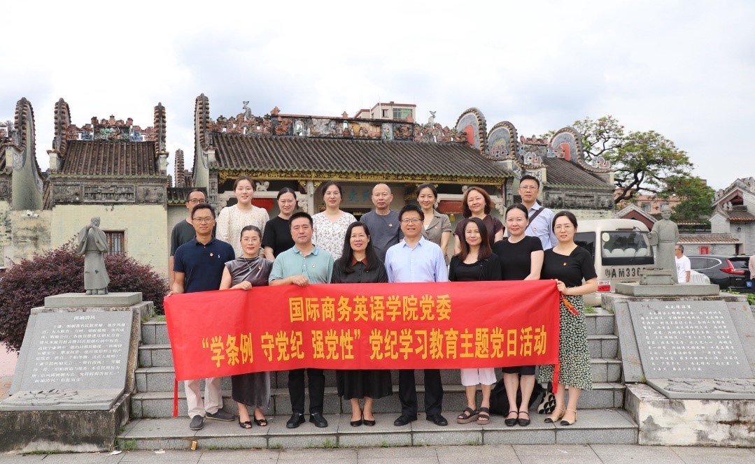 为深入开展党纪学习教育,引导学院党员干部学纪、知纪、明纪、守纪,5月22日下午,在院党委书记苏冬燕带领下,全体院领导,商务英语系党支部、国际商务系党支部、党政办党支部等党员教师代表一行17人,赴白云区周氏大宗祠廉政文化广场开展“学条例 守党纪 强党性”党纪学习教育主题党日活动。