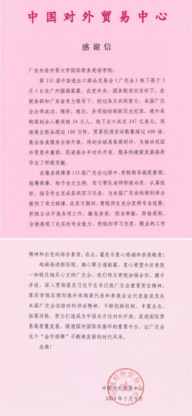 我院学子服务第135届广交会并获得中国对外贸易中心感谢信