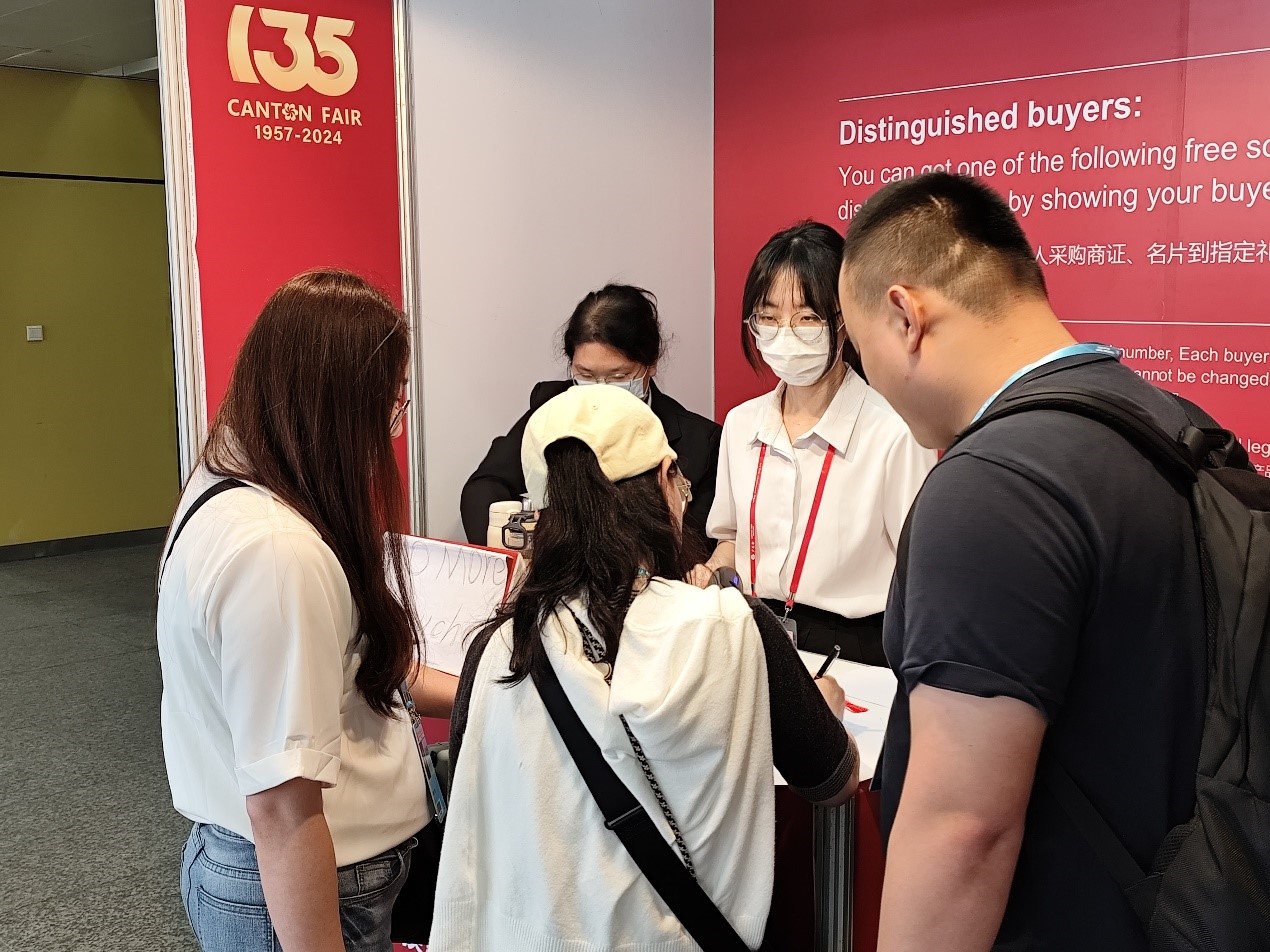 周乐华:我所在的岗位是新闻中心媒体联络组,我的主要任务是核对记者的身份信息和媒体资料,确保他们能够及时、准确地获得所需的证件和媒体包,此次我们共协助完成了1500余位媒体记者的办证与发证工作。在证件和媒体包的分发过程中,我与团队伙伴积极与记者沟通,了解他们的需求和反馈,不断改进工作方法和流程。另外我还参与了现场采访的准备工作,提前与记者沟通采访主题与内容,带领记者到达特定的展馆和展位。在跟随记者进行采访的过程中,我负责协调现场秩序,协助记者与客商进行沟通,确保采访的顺利进行。这是十分有趣的体验,我观察着记者的采访技巧和提问方式,学习了如何与不同背景的人进行有效沟通。通过与客商的交流,我也了解了广交会的热点话题和行业动态,对新闻行业的认识更加深入。