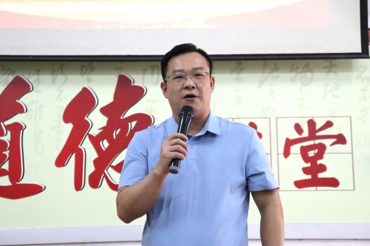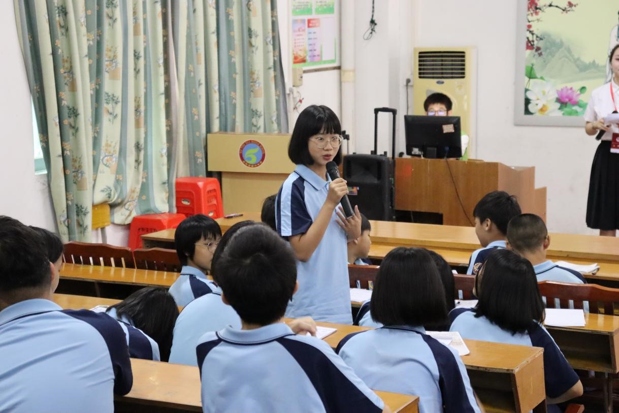 最后,开平校长梁新赞上台发表讲话。他首先引用了活动现场展板上的醒目标语——“家国情怀,跨山越海”,向不辞辛苦前来开平六中开展实践活动的侨乡邑梦实践团表示感谢,并对本次活动的成功举办和创新形式表示肯定和赞赏。随后,他深情地讲述了开平、赤坎古镇等地爱国华侨的英勇事迹及其为了家国利益,不辞辛劳,远渡重洋,展现出了华侨浓厚的爱国情怀。其中,他还特别提到了杰出的侨民司徒美堂对国家做出的巨大贡献,他的故事深深地打动了在场的每一位同学。最后,梁校长寄语同学们要厚植爱国主义情怀,让爱国主义精神在心中深深扎根,做爱党、爱国、爱社会主义的好青年,在未来的学习生活中努力奋斗,为自己,为社会,为国家拼搏进取,做出更大的贡献。