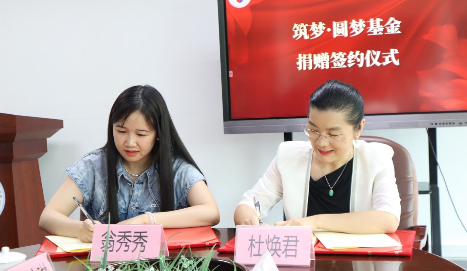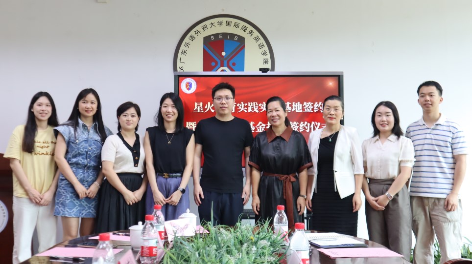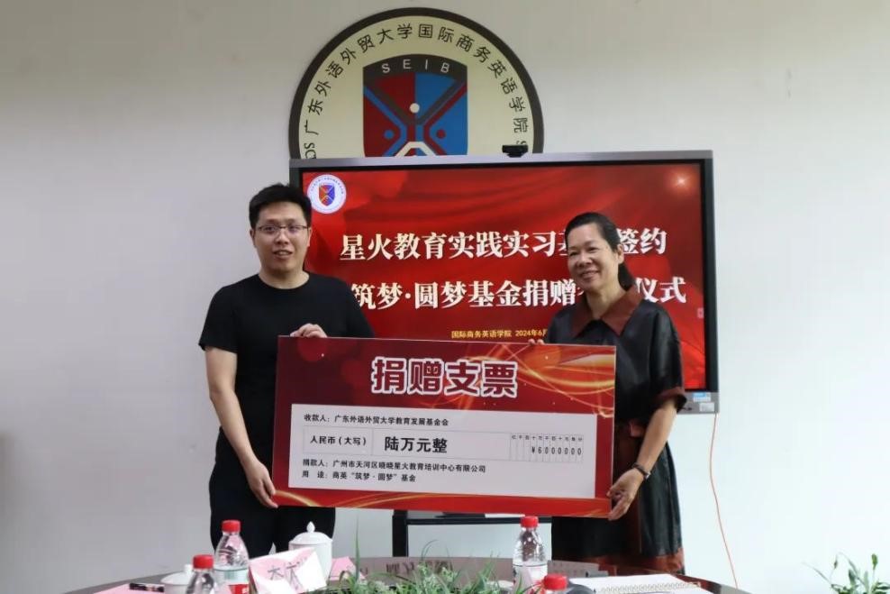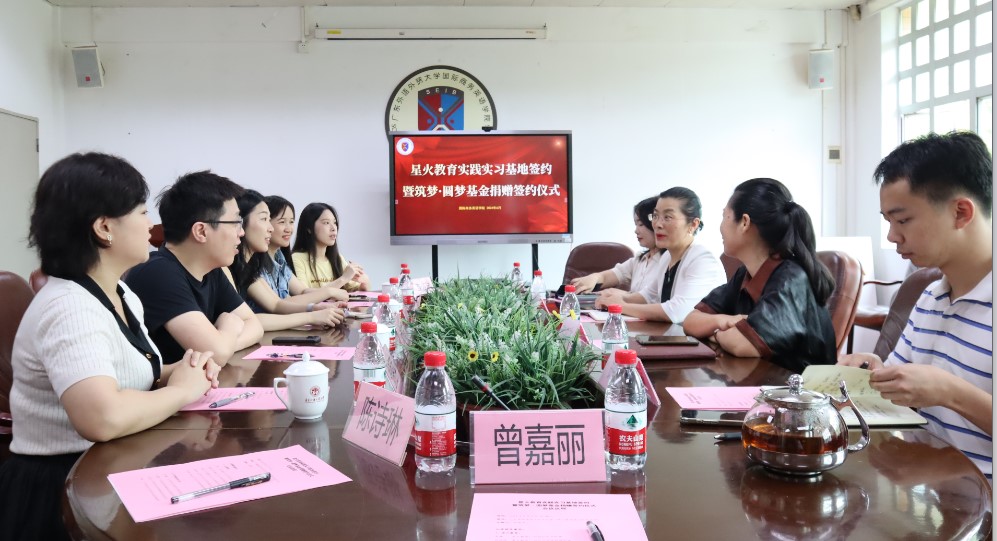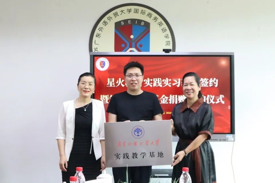 交流结束后,正式举行商英“筑梦·圆梦”基金捐赠签约仪式和大学生实践教学基地共建签约仪式。苏冬燕代表学校接受翁峰的捐赠并向星火教育授予实践基地牌匾,杜焕君和翁秀秀分别作为广外和星火教育代表签署协议,本次捐赠的六万元将纳入商英“筑梦·圆梦”基金,用于学院人才培养、人文关怀等各个方面,由“商英筑梦”基金管理委员会管理使用。