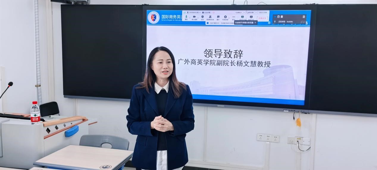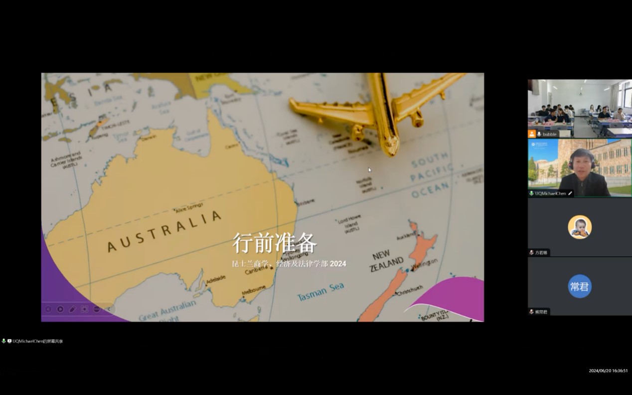 6月20日下午,国际商务英语学院在一教南楼219教室举行广东外语外贸大学-昆士兰大学硕士班第25期学员结业典礼暨行前培训会,会议以线上线下相结合的方式举行。国际商务英语学院副院长杨文慧教授,昆士兰大学商业、经济与法律学部大中华区区域经理Michael先生,项目授课教师曾成老师,国际项目中心韩金彪老师、丛瑾老师,辅导员陈思蓓老师出席活动,25期项目在读同学参加活动。活动由国际项目中心副主任韩金彪老师主持。