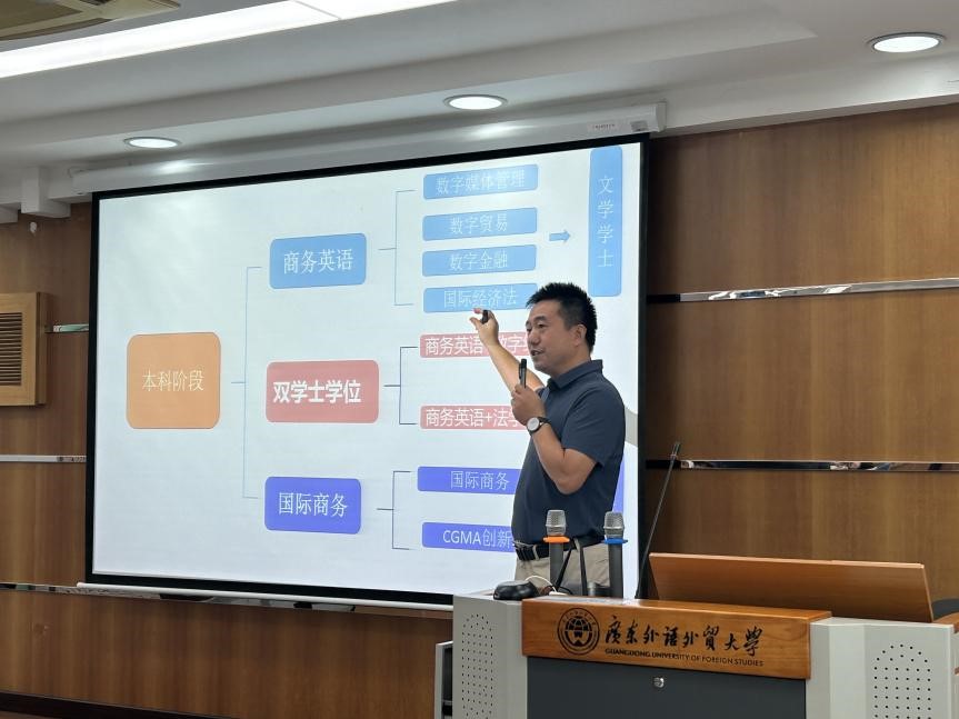之后,汪谓超对学院商务英语(法学双学位)专业的建设进行介绍。他讲到,本专业采用商务英语+法学+商科教育相结合的复合型办学模式,希望同学们在通过专业学习后,能有扎实的英语与法学基本功、文化素养良好、国际视野开阔,能通过自己的专业能力参与到涉外法律工作中,成为融通型涉外法治人才。随后,朋辈导师王粤和周菲凡介绍了一个多月以来班级的学习生活情况,同学们目前学习状况良好,积极参与各项活动。在这期间,朋辈导师积极为同学们提供生活与学习上的指导与帮助,关心新生,帮助新生尽早适应大学新生活。