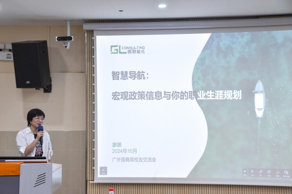 为深入学习党的二十届三中全会精神,积极贯彻党中央、国务院关于高校毕业生就业工作的决策部署,加强我院学生职业生涯教育和就业指导,10月24日晚七点,国际商务英语学院职业生涯规划教育专题讲座暨校外导师聘任仪式在第一教学楼成功举行。学院20届校友,现广外大宗商品交易研究院研究部副主任、上海钢联能化总经理廖娜受邀作题为“智慧导航:宏观政策信息与你的职业规划”的专题讲座。商英学院党委副书记杜焕君、绮枫运动康复创始人兼首席治疗师邹军出席本次活动,会议由学院辅导员方思懿主持,200余名同学到场聆听。