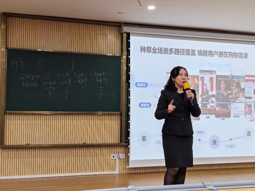 随后,陆总展开了精彩的讲座。她首先分享了营销人员日常工作的核心要素与必备素养,并结合今年“双十一”的营销案例,详细阐述了数据驱动的全域营销5A模型。接着,她通过高露洁牙膏的案例,讲解了4P模型在实际营销中的具体应用,深入分析了如何将理论知识与市场操作相结合。