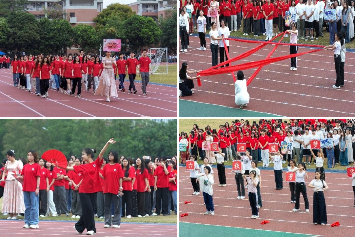 在开幕式方阵表演中,从青春洋溢的舞蹈到通过变换队形为广外60周年庆贺,商英学子将广外甲子华诞与奥林匹克精神完美融合,展现了传统与现代交织、拼搏与梦想同行的青春画卷。
