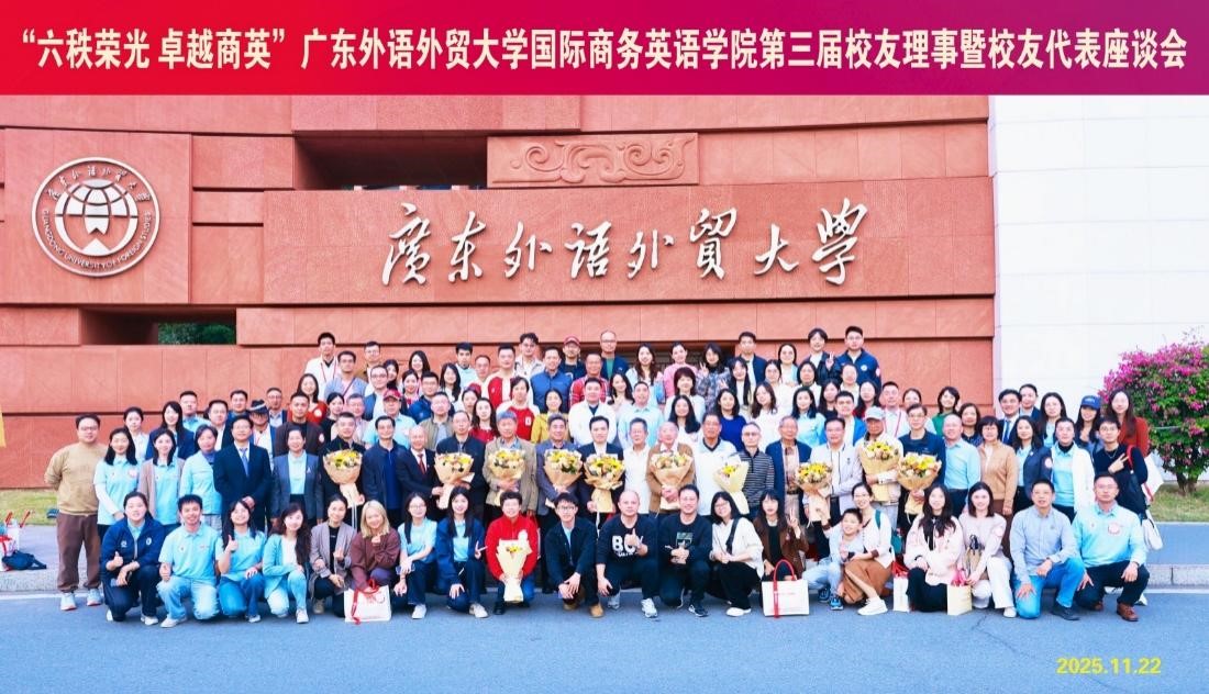 六秩弦歌不辍,薪火代代相传。在广东外语外贸大学建校 60 周年的喜庆氛围中,国际商务英语学院精心筹备的第三届校友理事暨校友代表座谈会圆满举行。近千位校友从五湖四海重返母校,以 “返校报到忆青春、座谈聚力谋发展” 的方式,为母校六十华诞献上最真挚的祝福,共绘商英学院未来发展新蓝图。