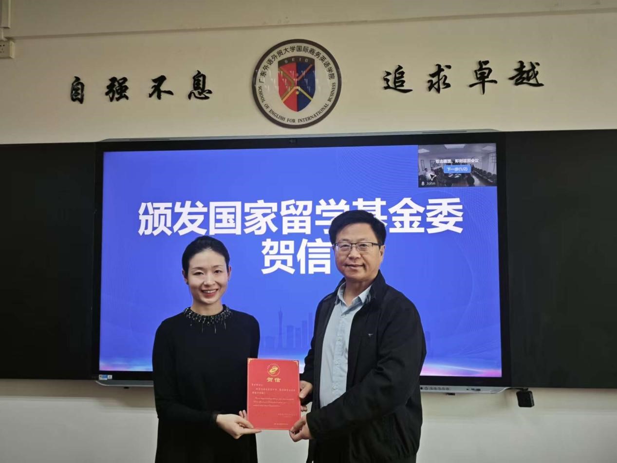 胡春雨为项目学员颁发国家留学基金管理委员会贺信,并合影留念。定格的影像,见证了学员们即将开启海外深造的崭新征程,承载着学院对师生未来学术之路的殷切期许与美好祝愿。