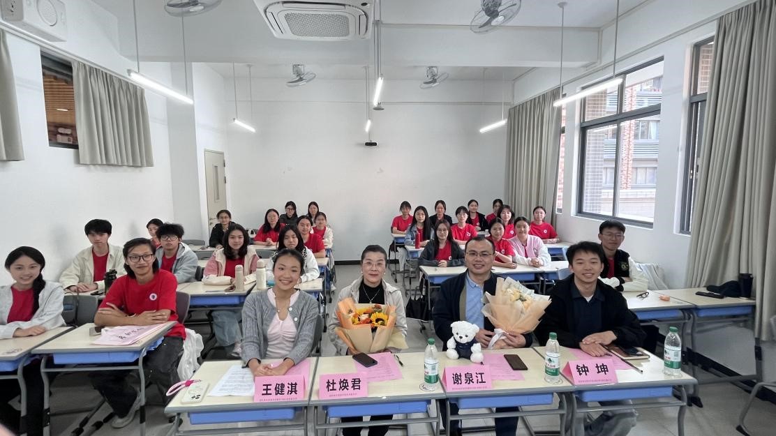 2025年12月4日下午,商务英语+数字经济双学士学位2502班(以下简称“数双2502班”)“四导一体”主题班会在广东外语外贸大学第一教学楼顺利举行。学院党委副书记杜焕君、校外导师谢泉江、辅导员钟坤、朋辈导师王健淇及数双2502班全体同学参加本次活动。班会由班长陈欣颖主持。