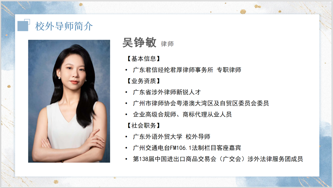 其后,耿士淇为师生们隆重介绍了商英2503班的校外导师吴铮敏律师。吴律师是广东君信经纶君厚律师事务所的专职律师,也是广州市律师协会粤港澳大湾区及自贸区委员会委员、广州交通电台法制栏目客座嘉宾以及第138 届中国进出口商品交易会(广交会)涉外法律服务团成员,拥有广东省涉外律师新锐人才、企业高级合规师、商标代理从业人员等专业资质。其亮眼的履历让在场同学对接下来的交流充满期待。