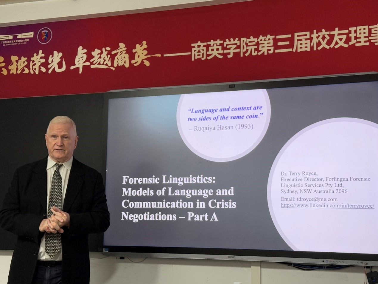 11月25日晚,Terrence Royce 教授开展法律语言学专题首讲,主题为 “Models of Language and Communication in Crisis Negotiations A”,由张少敏老师主持。Terrence Royce 教授开篇引述 Ruqaiya Hasan “语言与语境如硬币两面” 的思想,提出法律语言与法律语境的互动性;随后他重点介绍系统功能语言学语境理论,阐释语场、语旨、语式构成的语域模型,及三大元功能的沟通协同作用,强调语言是情境驱动的社交符号系统。最后他结合实际案例,剖析危机谈判全阶段的语言策略,指出主动倾听、语境适配是关键。本次讲座融前沿理论与实战,明晰了学科框架与应用价值,为相关学习实践提供启发。