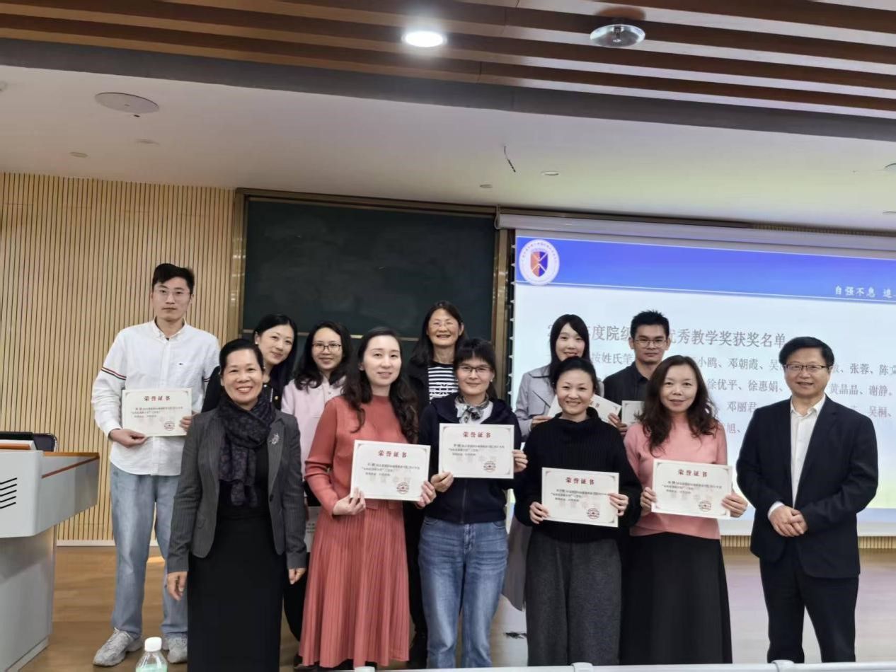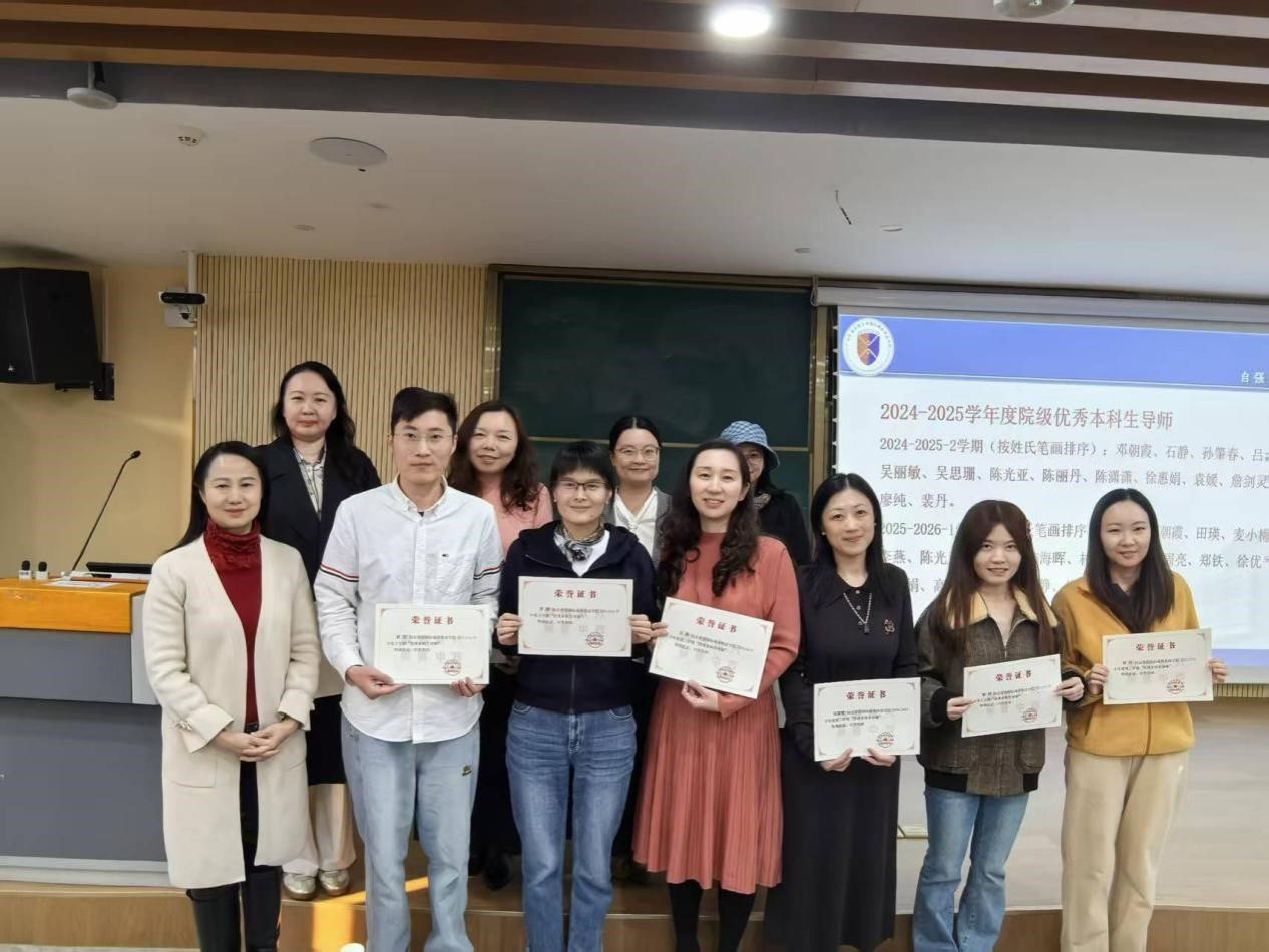 会上还表彰了学院2024-2025学年度院级优秀本科生导师和2024年度院级本科优秀教学奖,苏冬燕书记、胡春雨院长、杨文慧副院长和陈潇潇副院长为获奖教师颁发荣誉证书并合影留念。