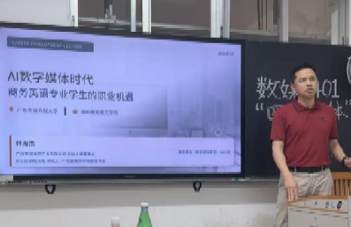 随后,林海杰校友结合自身经历,从行业发展现状、核心能力要求、职业发展路径三个维度展开分享。他细致剖析了当下数字媒体管理行业的发展趋势与就业机遇,讲解了行业对商务英语能力、数字运营技能等复合型素养的要求,并结合实际案例为同学们梳理了校园学习与职场实践的衔接要点,为大家的职业规划与能力储备提供了极具参考价值的建议。