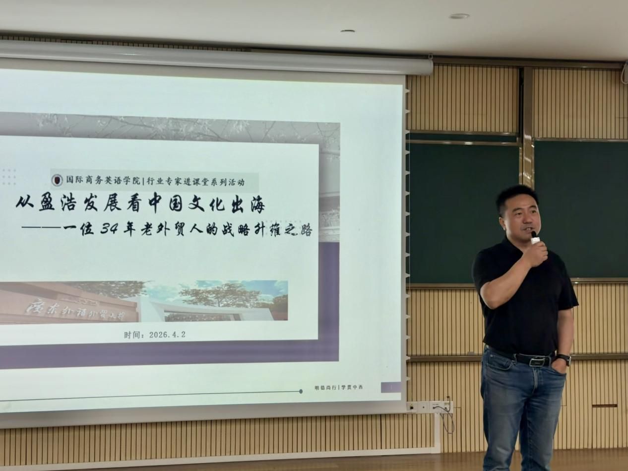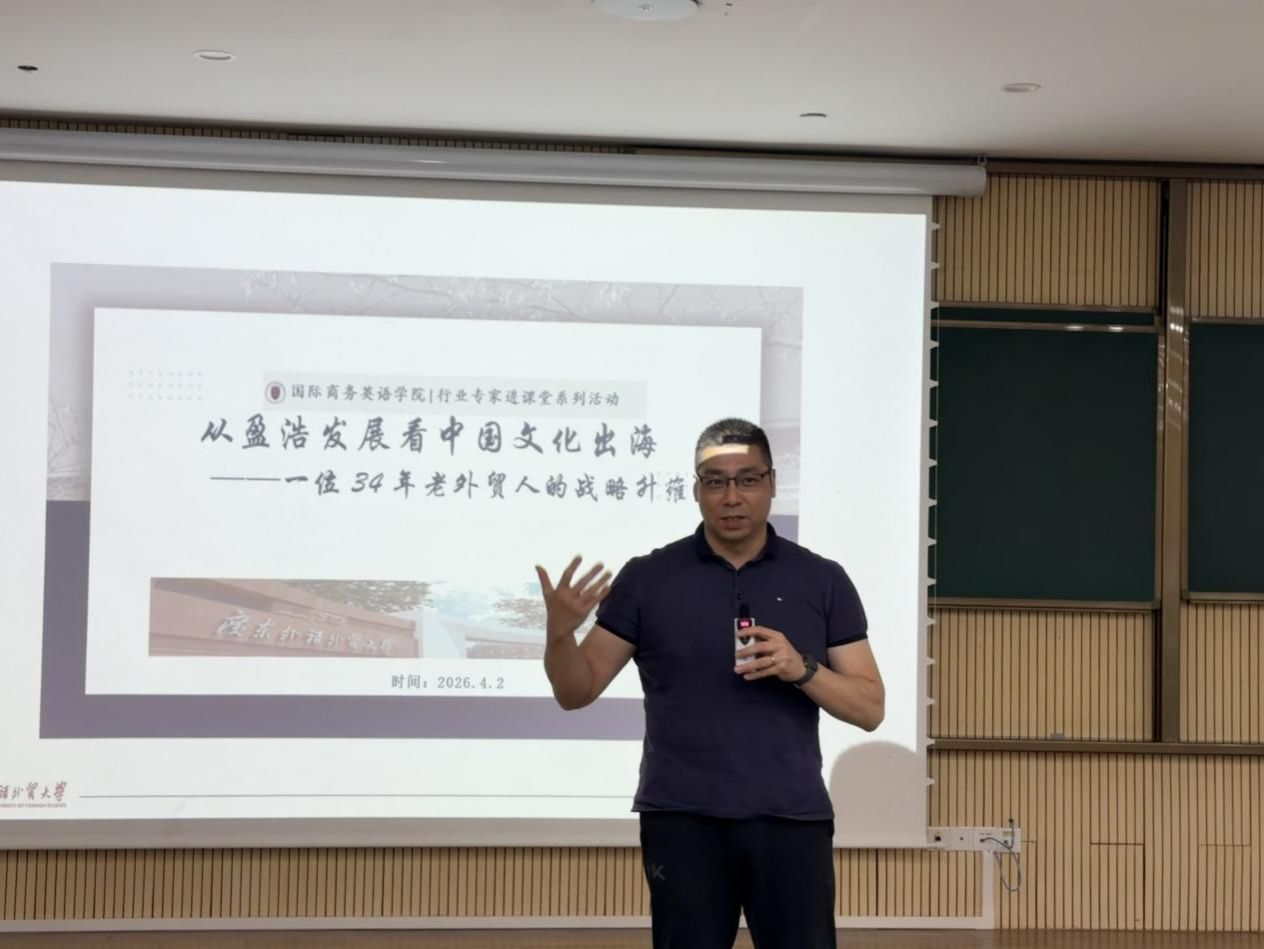 4月2日下午,广东外语外贸大学国际商务英语学院在第一教学楼时代讲堂举办“行业专家进课堂”活动。本次活动邀请盈浩文化创意股份有限公司创始人、广外优秀校友罗慧枰女士,以“从盈浩发展看中国文化出海——一位34年老外贸人的战略升维之路”为主题,为商务英语专业大一学生带来了一场精彩的讲座。学院党委书记苏冬燕、副书记杜焕君、副院长汪谓超,以及课程组王伟强老师、高兴刚老师、黄晶晶老师出席活动。
