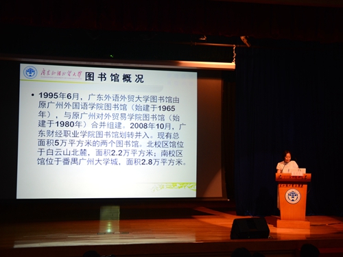 祝黎与夏翠军分别做了关于“校园网络及信息资源应用”和“图书馆资源利用”的专题讲座,尽显广外智慧。祝黎详细介绍了我校教育技术中心的组织架构和运行机制,并全方位解密了“数字广外”的强大功能,给同学们在学习生活中可能遇到的问题提供了许多解决方案。夏翠军通过两个介绍图书馆的视频点燃了现场同学的热情,随后她全面介绍了图书馆的布局构成、丰富资源和人性化服务,并希望同学们能够多去图书馆,爱上图书馆,图书馆与同学们的成长同行。