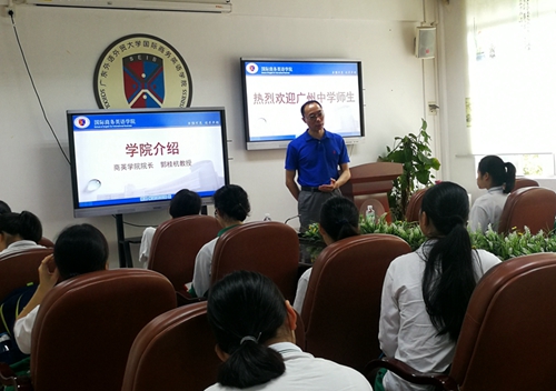郭桂杭院长代表商英全体师生对广州中学师生参观广外和商英表示热烈欢迎,简要介绍了广外的基本情况和国际化特色,并着重向广州中学师生介绍了商英学院的专业特色、师资队伍、人才培养和近年招生情况,并现场回答了同学的提问。