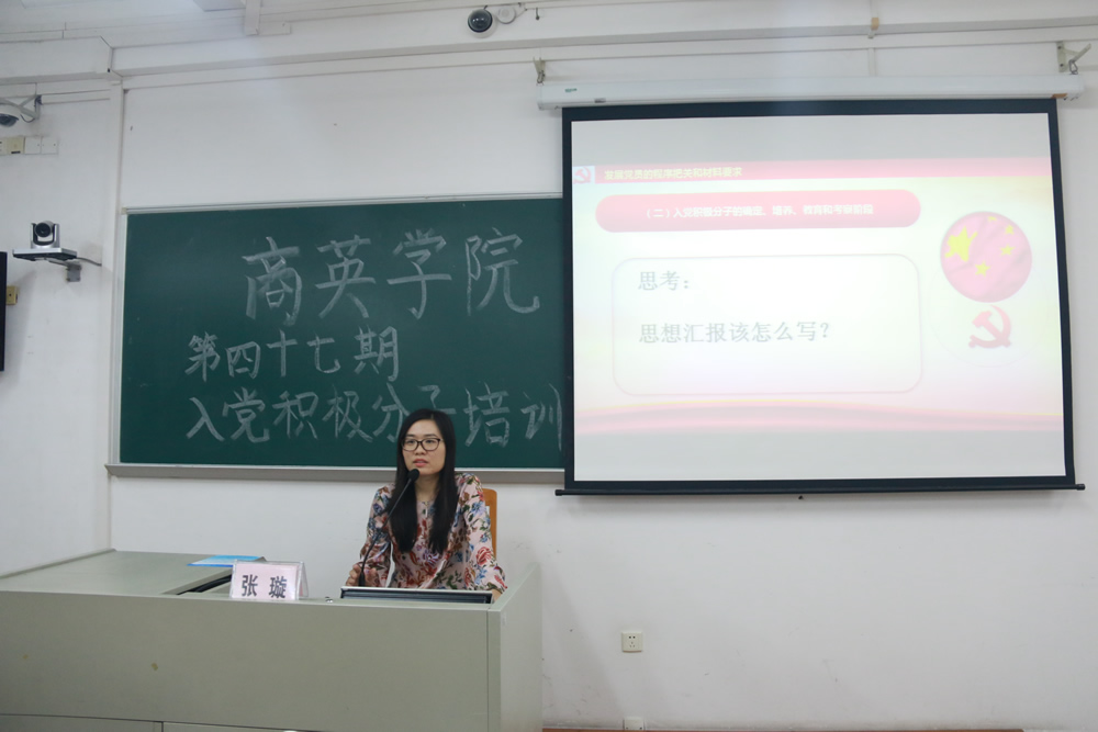 11月8日晚,商英学院第四十七期入党积极分子在六教B412听取了《发展党员的程序和要求》的专题党课,本次主讲嘉宾为校党委组织部组织科张璇老师,院党建指导老师陈琳琳主持。