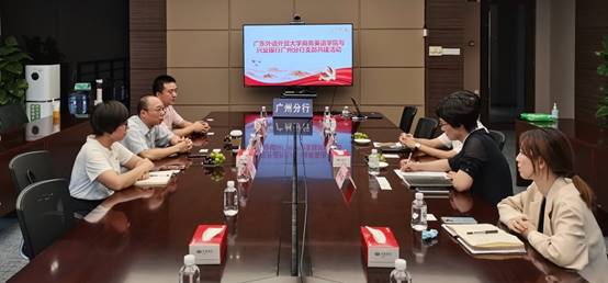 6月21日下午商英学院英语教学部与兴业银行广州分行的党建共建活动在兴业银行大厦18楼会议室举行。参加会议的人员包括院长兼党委副书记郭桂杭教授、英语教学部主任、支部书记汪谓超副教授、教师代表许琪副教授、学生代表吴沅洋。兴业银行出席活动的有广州分行企业金融部总经理兼第七支部书记余小峰、机构业务部总经理徐玉茹、人力资源部副总经理周娅。