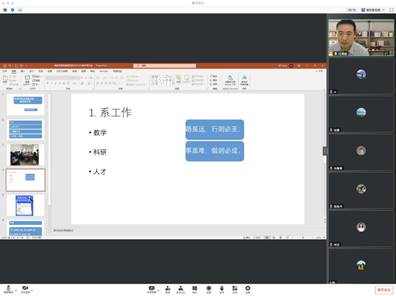10月20日下午3:30国际商务英语学院英语教学部在腾讯会议平台进行了质量月教学研讨暨“三进”虚拟教研室活动。学院彭玲玲、胡春雨副院长、系部主任汪谓超和英语教学部及学院教师共三十余人参加了此次教研活动。本次教研活动由汪谓超主持,围绕系里工作、教师成长和创新教学及课程思政展开了分享和讨论。