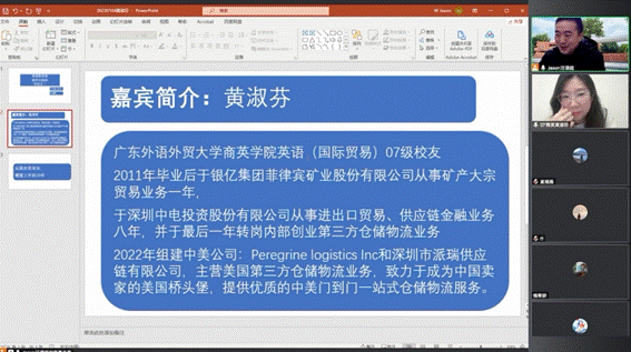 2023年1月4日下午3:00-4:30,我院邀请了商英学院2011届商务英语专业国际贸易方向毕业生黄淑芬女士在腾讯会议平台作了题为“从国企到创业跨境电商——我的故事”的分享会。讲座由汪谓超副教授主持,逾40名师生参加了本次讲座。