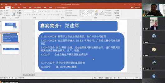 2023年1月5日下午3:00-4:00,我院邀请了“开丽”品牌、健朗医用科技有限公司的创立者郑建辉先生在腾讯会议平台作了题为“从0到1——成长的故事”的分享会。讲座由汪谓超副教授主持,商英学院部分师生参加了本次讲座。