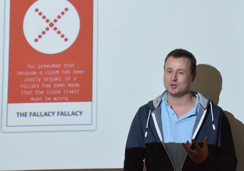 交流活动以来自复旦大学的Patrick老师的“逻辑谬误”专题讲座展开。Patrick老师为大家讲解了辩论中经常出现的逻辑谬误及其5种基本类型,如slippery slope、straw man、begging thequestion。在同学提问环节中,有同学提问在真正的辩论赛中应如何应用这些知识来提高辩论能力。Patrick老师回答,逻辑谬误不需要死记硬背,只需用来找出自己以及对方辩友逻辑当中的错误,因为在真正的辩论赛中依然时刻想着这五条例子会影响发挥。他建议同学们在辩论时要为听众解释自己辩论逻辑之间的关系,虽然听众很聪明,但也不能认为他们无所不知,无所不晓。最后,Patrick还向大家介绍推荐了Toulmin’sModel ofArgument(图尔敏论证模式),希望同学们能够从中受到更大的启发。