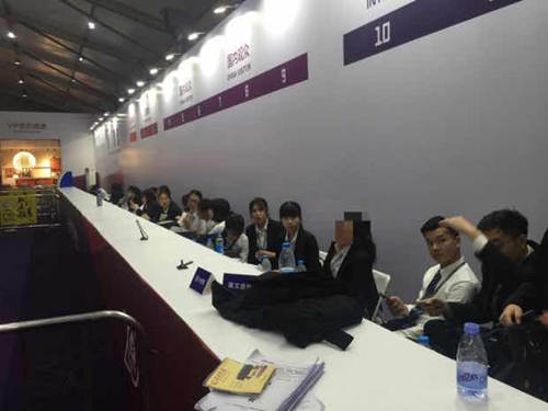 在领队尽职尽责的带领下,商英学院的同学们早早就来到了展览会现场,女生精致,男生帅气,闪亮登场。大家首先抵达白色帐篷搭建的报到处,整理仪容仪表,准备投入新一天的工作。