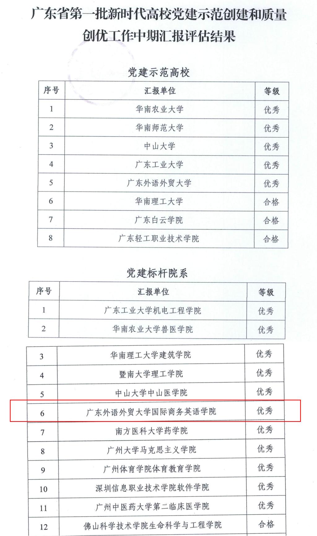 近日,中共广东省委教育工委公布了首批新时代高校党建示范创建和质量创优工作(以下简称“双创”工作)中期汇报评估结果,我院党委作为全省28个党建工作标杆院系之一,获得评估结果优秀。