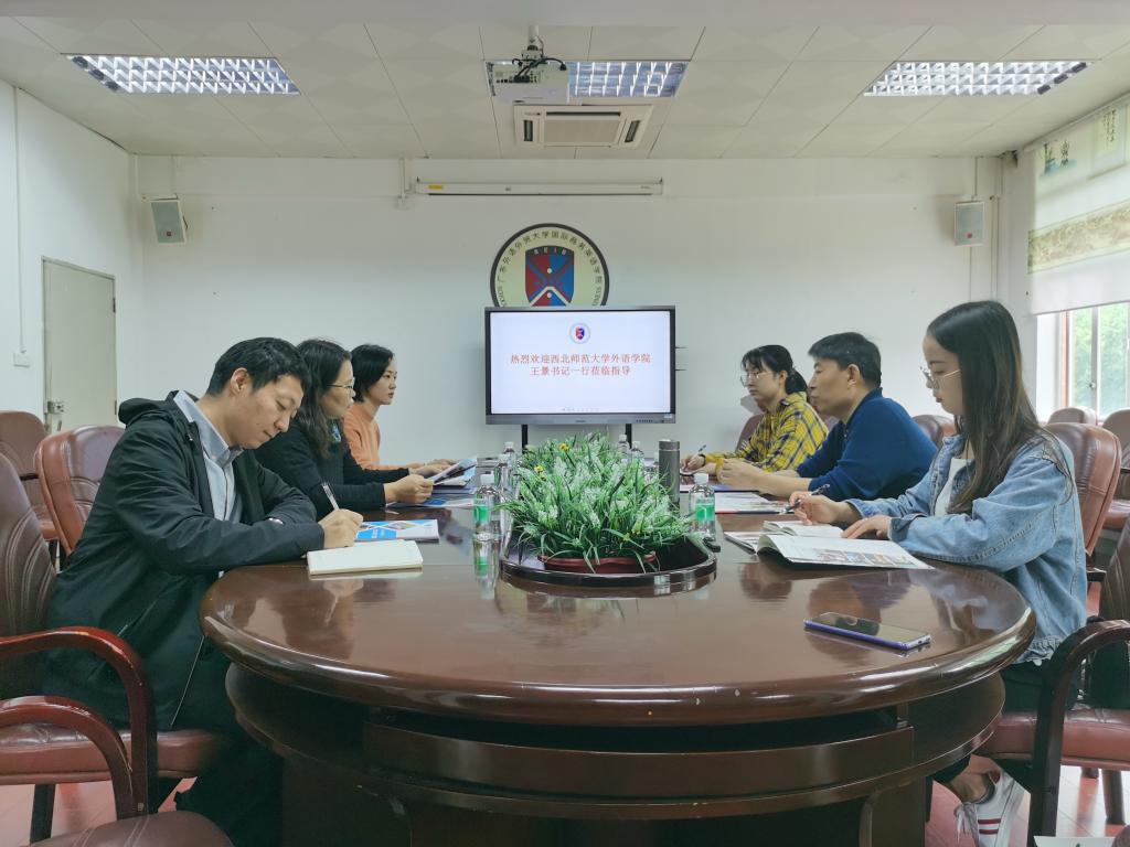 王景对我院的热情接待表示感谢,他高度评价了学院近年来党建工作取得的成就,简要介绍了西北师范大学外国语学院的学科设置、人才培养、第二课堂建设等情况,希望两院进一步加强合作,相互支持。