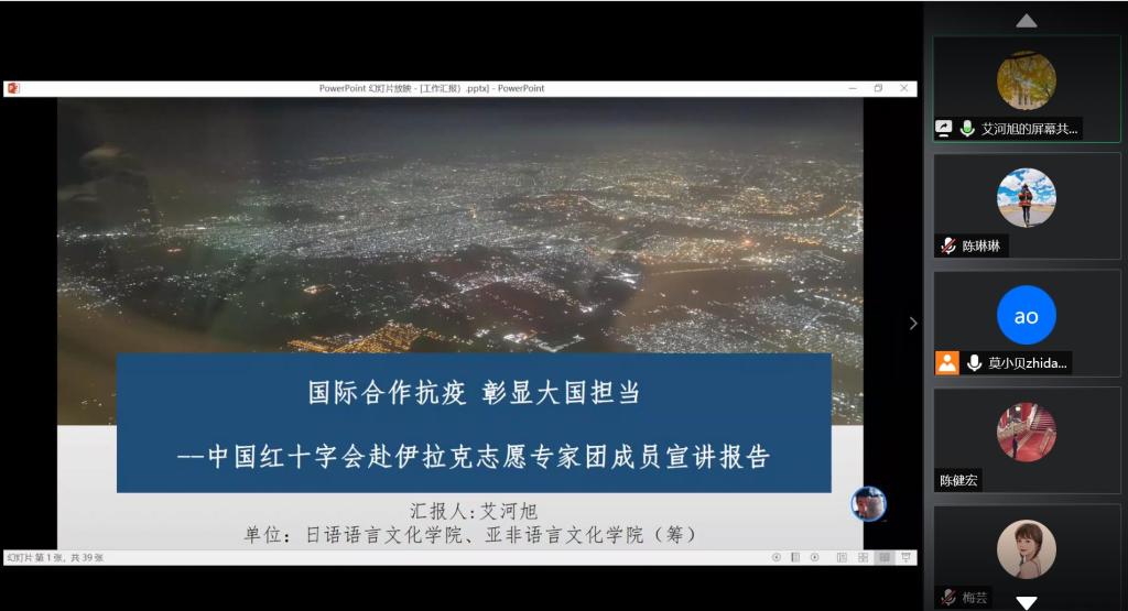 艾河旭作题为《国际合作抗疫 彰显大国担当》的专题报告。作为中国红十字会援助伊拉克防控疫情志愿专家组成员,艾河旭向毕业生党员介绍了专家组在伊拉克的抗“疫”工作开展概况。专家组到达使馆后立即成立了临时党支部,在馆党委的领导下,团队克服疫情、战争等种种危险和人在海外的重重困难,迅速展开工作,在抗疫一线充分发挥先锋模范作用。一位党员,就是一面旗帜,一个临时党支部,就是一座战斗堡垒。疫情不会摧垮共产党员的意志和信念,危难关头的挺身而出,让我们更加充满了魄力、凝聚了力量。艾河旭希望毕业生党员永葆家国情怀,积极响应党和国家的号召,增强自身的社会责任感和使命感。
