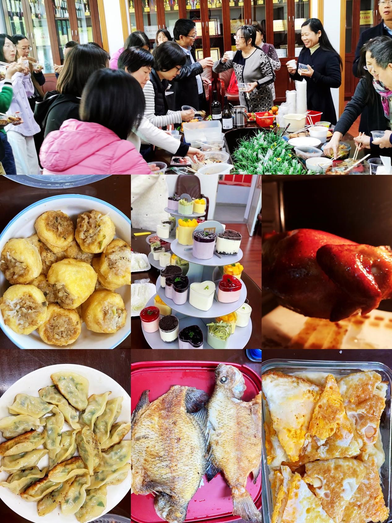 活动当天,老师们一展厨艺、欢聚一堂,用行动犒劳一起拼搏的同事和努力奋斗的自己,畅谈一年的收获和感动,期盼新一年的到来。有的老师带来了拿手好菜,如迷迭香烤鸡、红烧猪颈肉、糯米排骨、红枣枸杞银耳羹、香蕉蛋糕、酒酿汤圆等;有的老师分享了家乡菜,如荆州鱼糕、淄博酥锅和五香板肚、江西香肠、攸县香干等。老师们一边品尝美食,一边亲切交谈,现场香飘四溢、其乐融融。