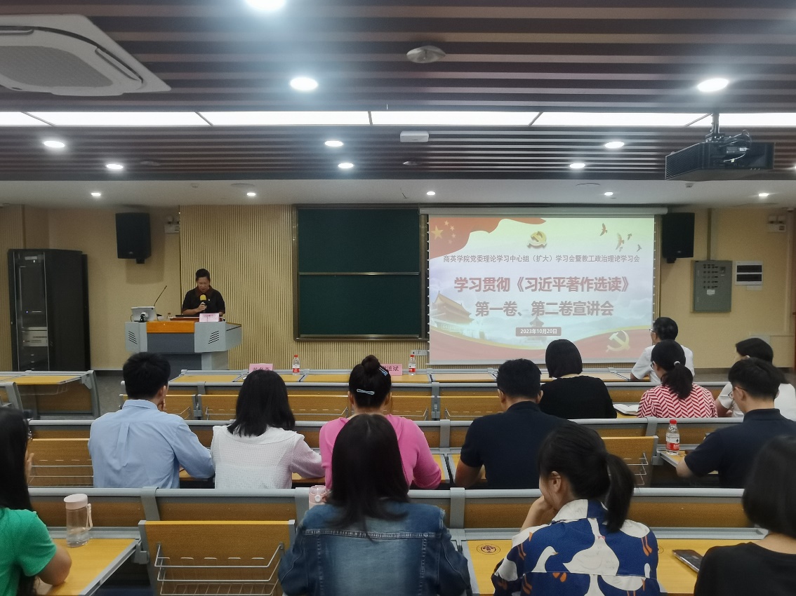 为进一步深入学习贯彻习近平新时代中国特色社会主义思想,打牢理论基础,根据学校党委部署要求,2023年10月20日上午,国际商务英语学院在北校区一教南215思明讲堂举行商英学院党委理论学习中心组(扩大)学习会暨教工政治理论学习会,聚焦学习贯彻《习近平著作选读》第一卷、第二卷,邀请我校宣讲团成员、马克思主义学院名誉院长、教授谢迪斌为师生党员代表、入党积极分子120多人作专题宣讲。学院党委书记苏冬燕主持会议。