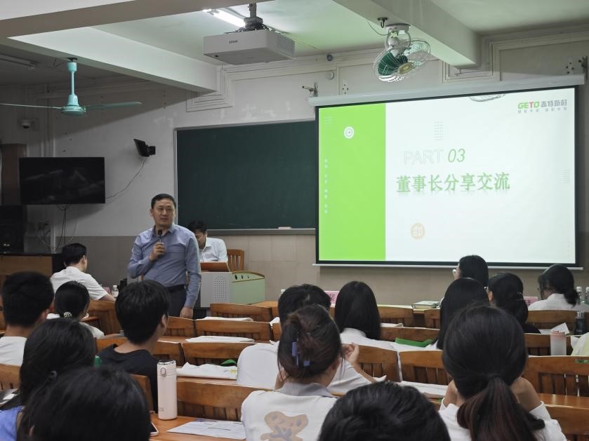座谈会后,志特集团一行到二教132开展校园招聘宣讲会,80多名商英学子参与本次活动。宣讲会上,志特集团围绕集团概况、行业发展、经营产品、生产基地、资质荣誉、代表项目等方面,向学生进行详细介绍,帮助学生更好了解企业。随后,高源董事长就个人就业创业经历向在座学生做分享,为学生人生道路选择和职业方向确定提供有益参考。